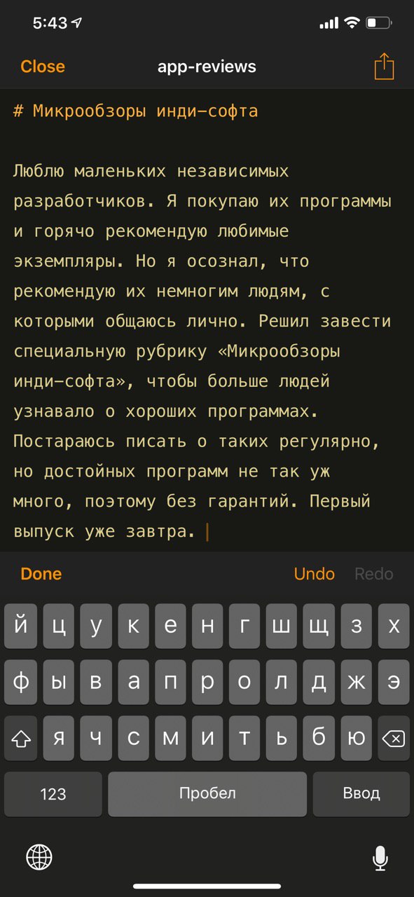 Я много всякого набираю каждый день в текстовых редакторах, поэтому очень люблю и ценю хорошие программы для работы с текстом. В прошлом году я открыл для себя Pretext для iOS. Это простейший plaintext-редактор с поддержкой маркдауна. Можно открыть файлик прямо из Дропбокса или iCloud'а и удобно отредактировать. Настраивается размер шрифта, а если заплатить за встроенную покупку (что лично я сделал), то будет доступна приятная тёмная тема и выбор иконки приложения. Программка простая как молоток, этим и хороша.